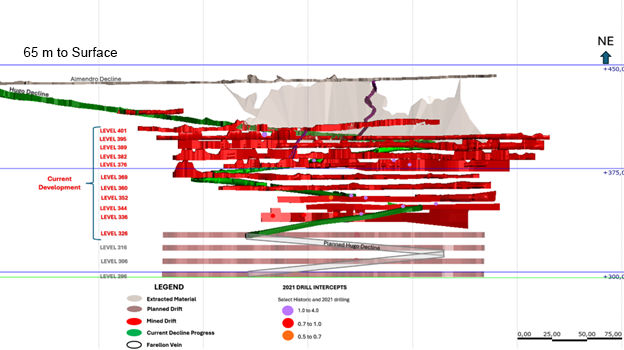 Sectional view of Farellon’s underground operations*. Intervals are core length – estimated true width is ~70-80% of core length. The decision to commence production at Farellon is not based on a feasibility study of mineral reserves demonstrating economic and technical viability and there is increased uncertainty and economic and technical risks of failure associated with the production decision.