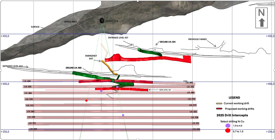 - Development was focused on the 425 m, 400 m and 392 m levels as outlined in Figure 1. Development was also conducted in the ceilings of the 400 m and 391 m levels